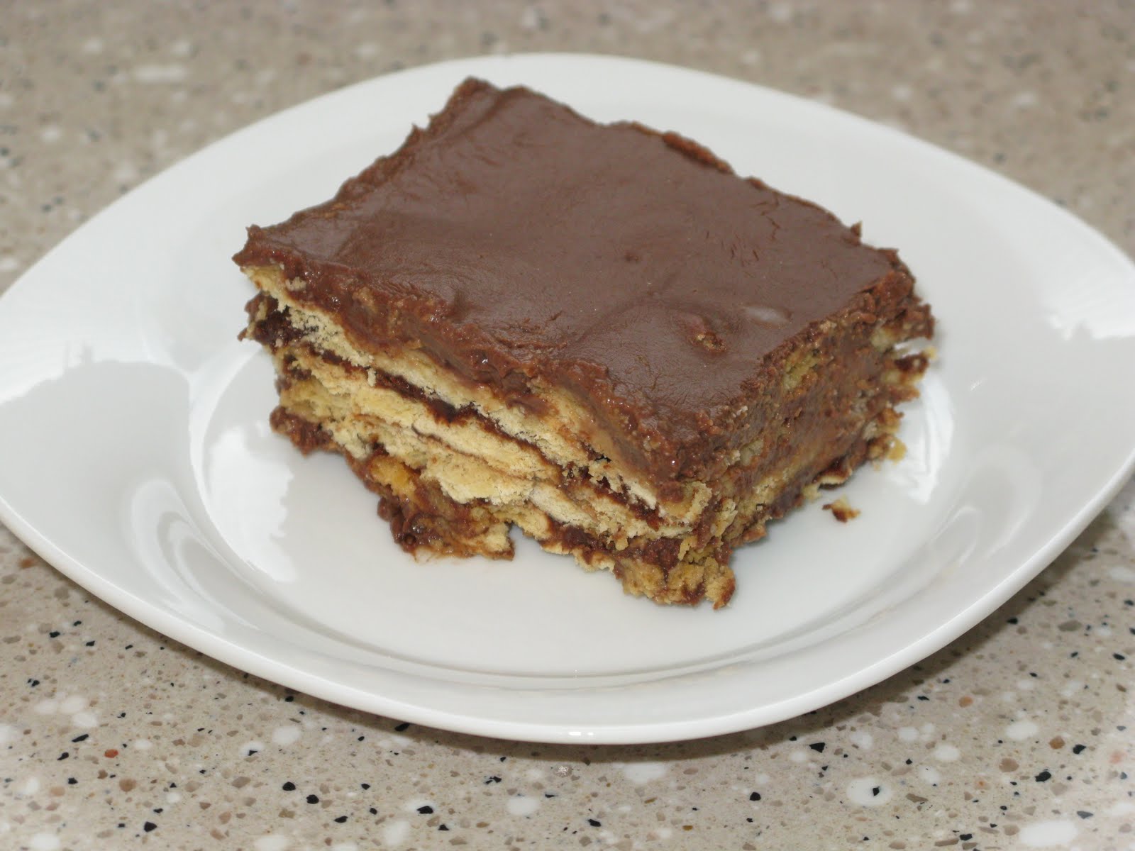 Gâteau Construction: Au lieu de la forme d'une première couche de crème au chocolat, puis une couche de biscuits trempés dans de la crème de beurre et de chocolat, Puis une autre couche de biscuits seulement (pour remplir de petits trous avec des morceaux de biscuits), une couche de crème au chocolat, et ainsi de suite, jusqu'à ce qu'il se est terminée dans une couche de crème au chocolat.