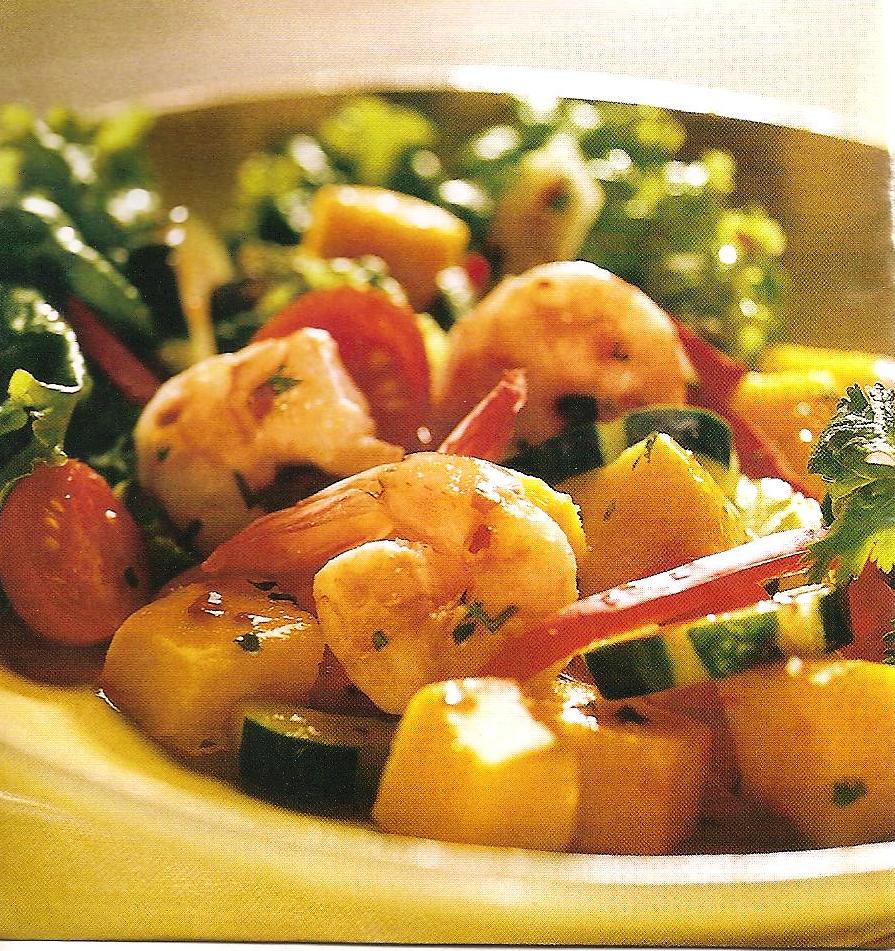 Organizzare 1 / 4 tazza di mango, 1 / 4 tazza di ravanello, in 1 cucchiaio di avocado intorno ai gamberetti su ogni piatto. Torna all'inizio ogni servizio con 2 cucchiai di cipolle verdi e 1 1 / 2 cucchiaini di semi di zucca.